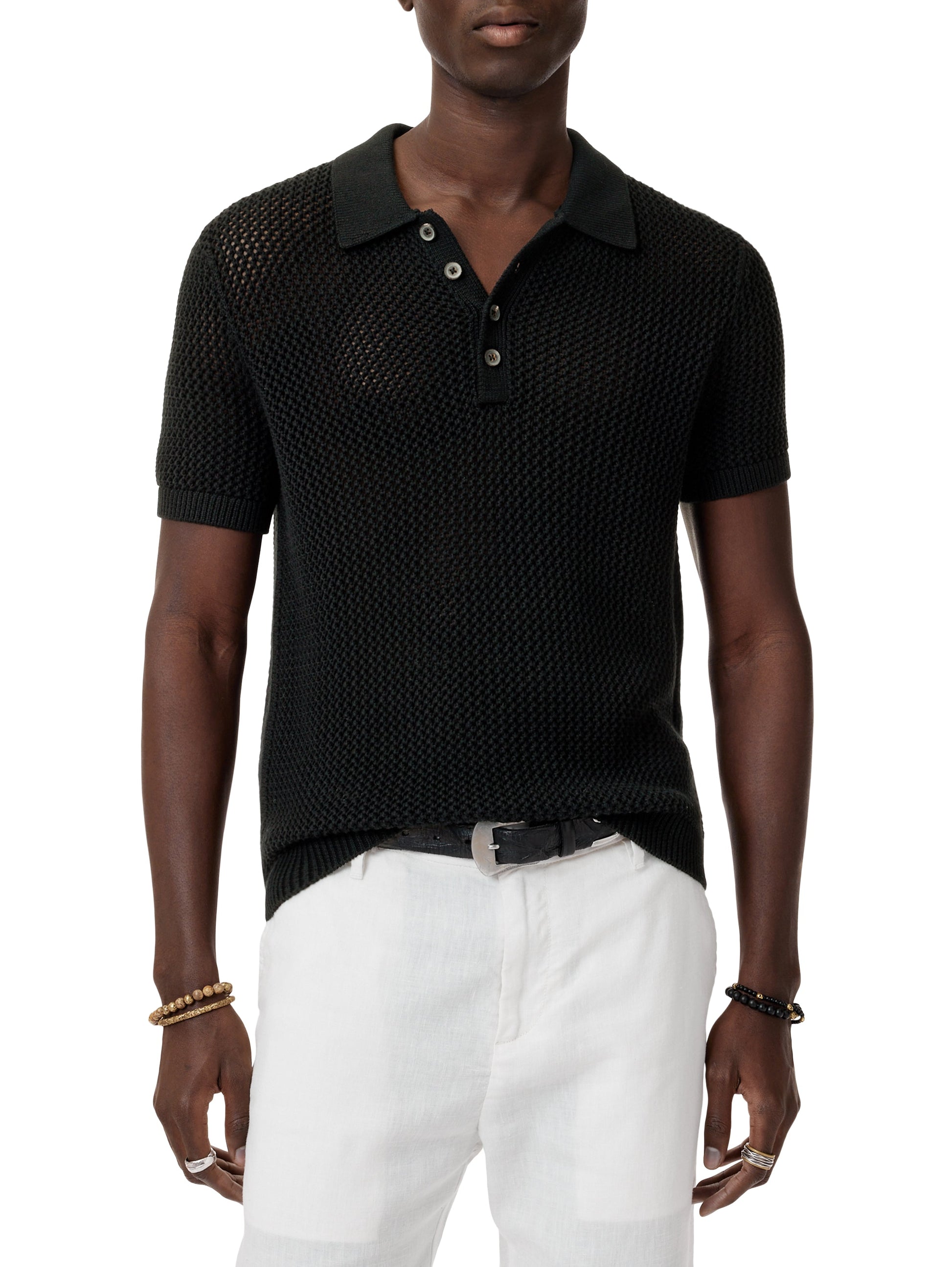 - Bold open-weave knit polo in deep black